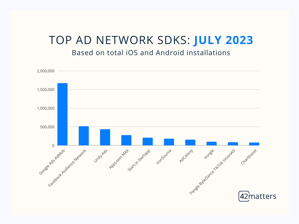 First up, let’s look at how things stand among Ad Network SDKs. Currently, Google Ads AdMob is installed on 1,670,581 iOS and Android apps. This makes it far and away the most popular ad network on the market.