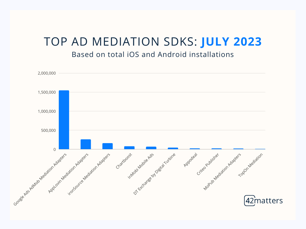 Unsurprisingly, Google’s dominance extends to ad mediation as well. The Google Ads AdMob Mediation Adapters SDK is installed on 1,544,933 iOS and Android apps, which is more than six times as many as the next closest competitor. Check it out…