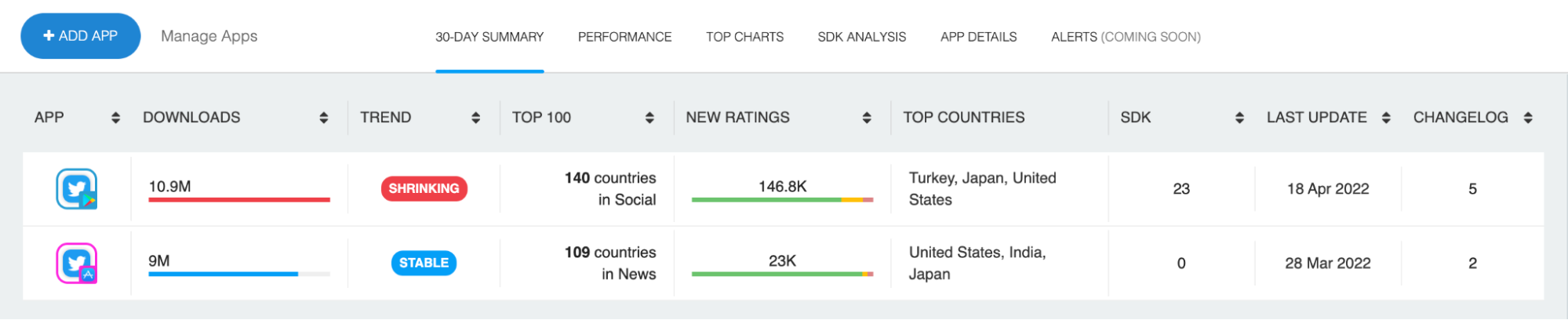 First, here’s a brief snapshot of how the Android and iOS versions of Twitter have performed over the last 30 days (March 20th, 2022 - April 19th, 2022):