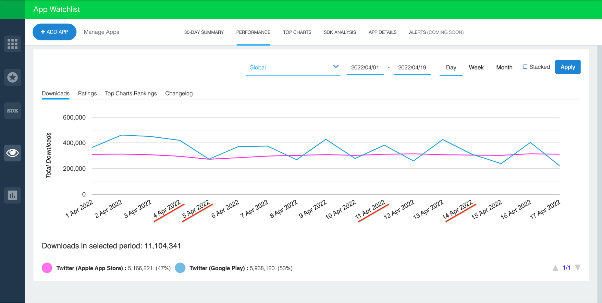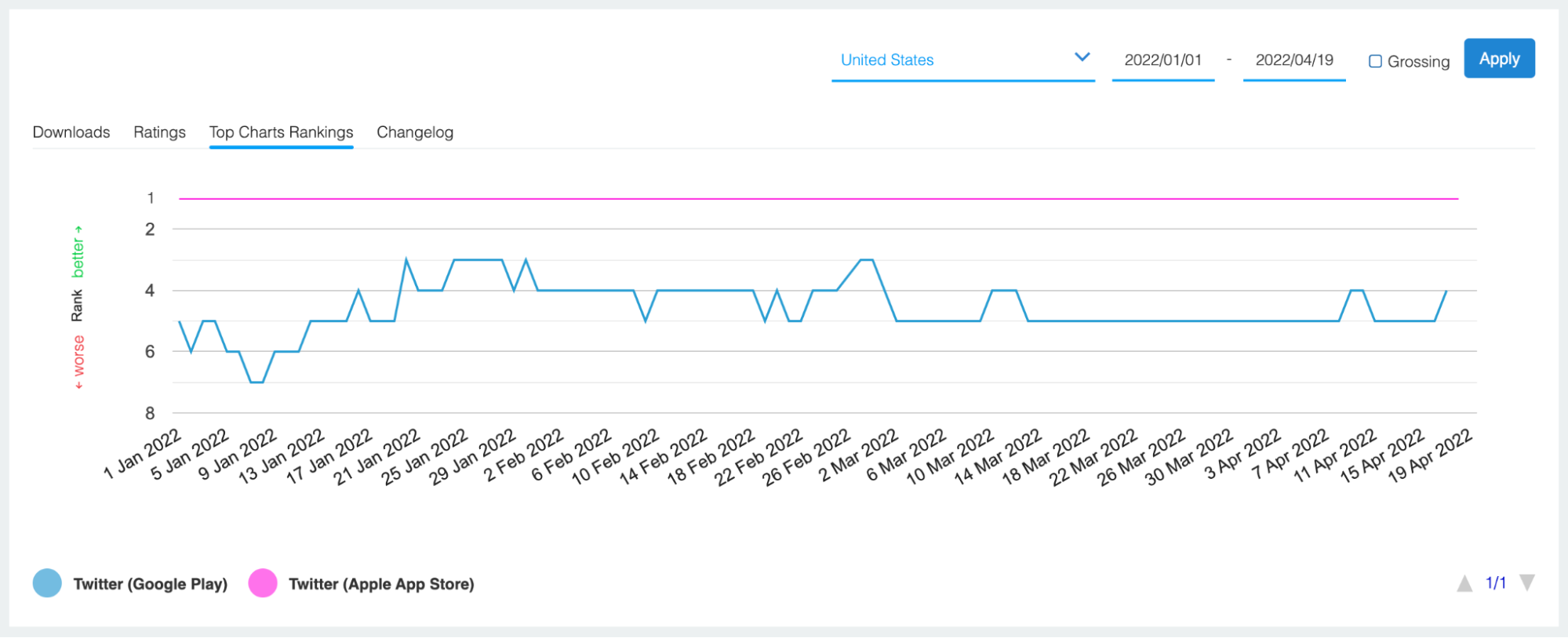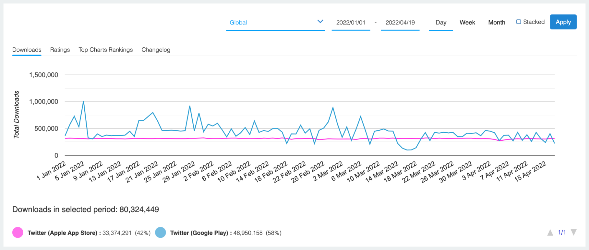 Above you’ll find daily downloads for the iOS (in purple) and Android (in blue) versions of Twitter. More specifically, this chart depicts global downloads between January 1st and April 19th, 2022.