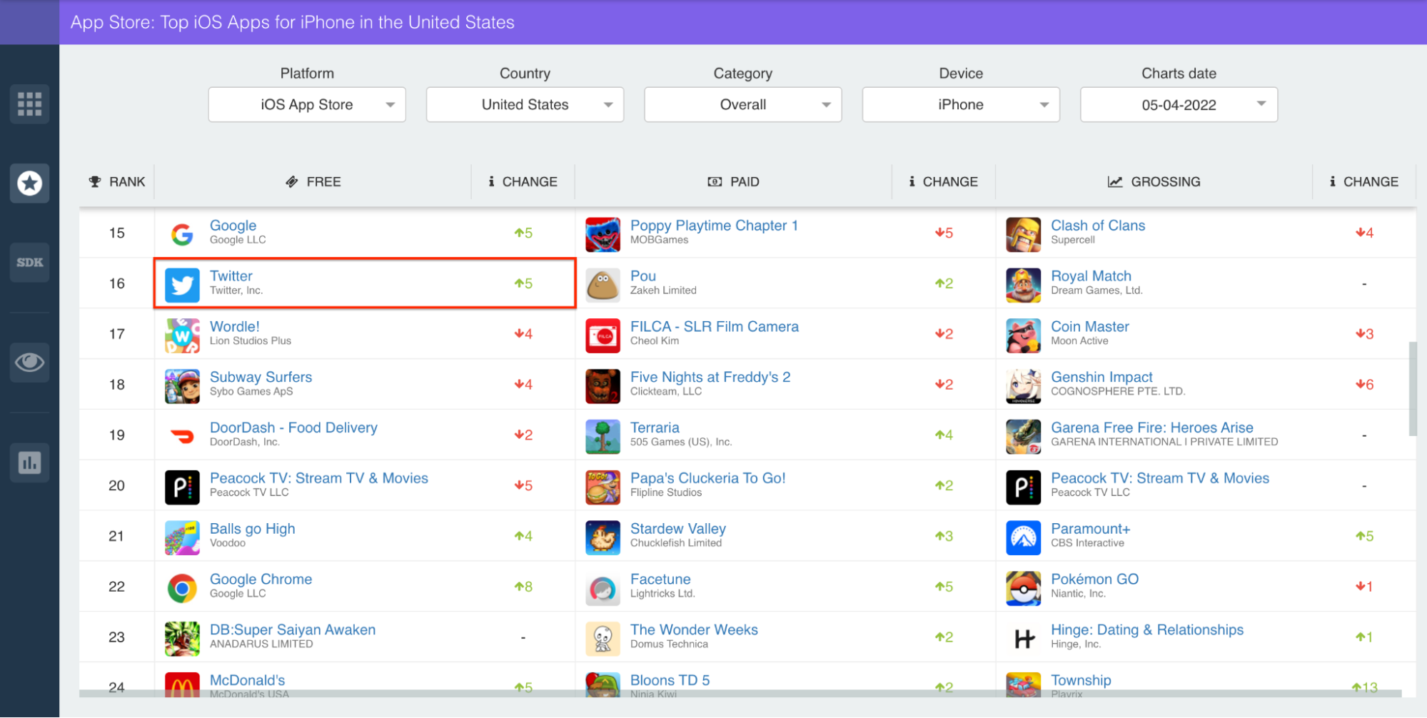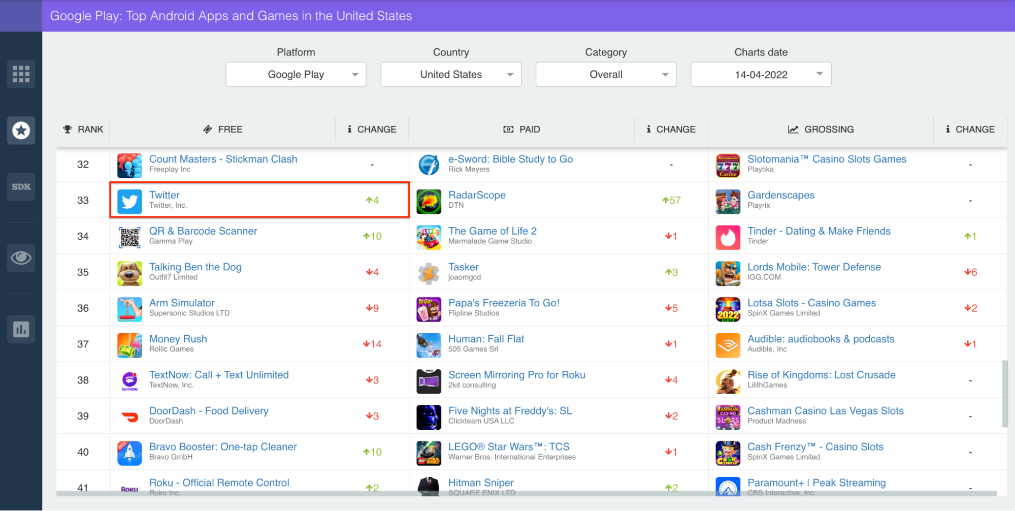 The top chart rankings tell a similar story. Above, you’ll find Twitter’s daily, category-specific rankings in the United States. In this case, the iOS version falls into the ‘News’ genre, while the Android version is categorized under ‘Social.’